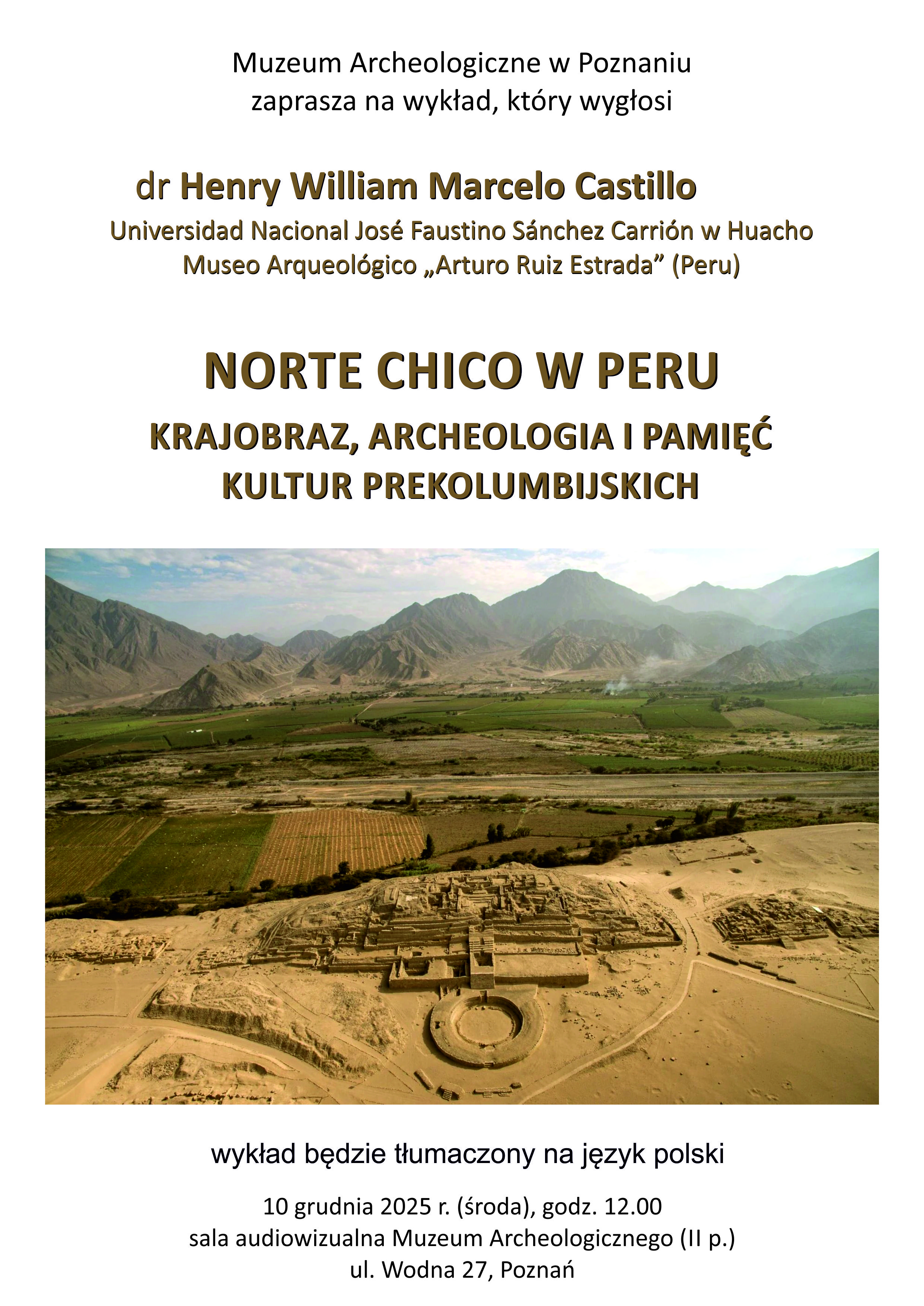 Dr Henry William Marcelo Castillo z Universidad Nacional José Faustino Sánchez Carrión w Huacho oraz Museo Arqueológico „Arturo Ruiz Estrada” (Peru) opowie o fascynującej krainie Norte Chico – miejscu, gdzie ponad 5000 lat temu powstały monumentalne kompleksy, centra ceremonialne i unikalne tradycje społeczno-kulturowe.