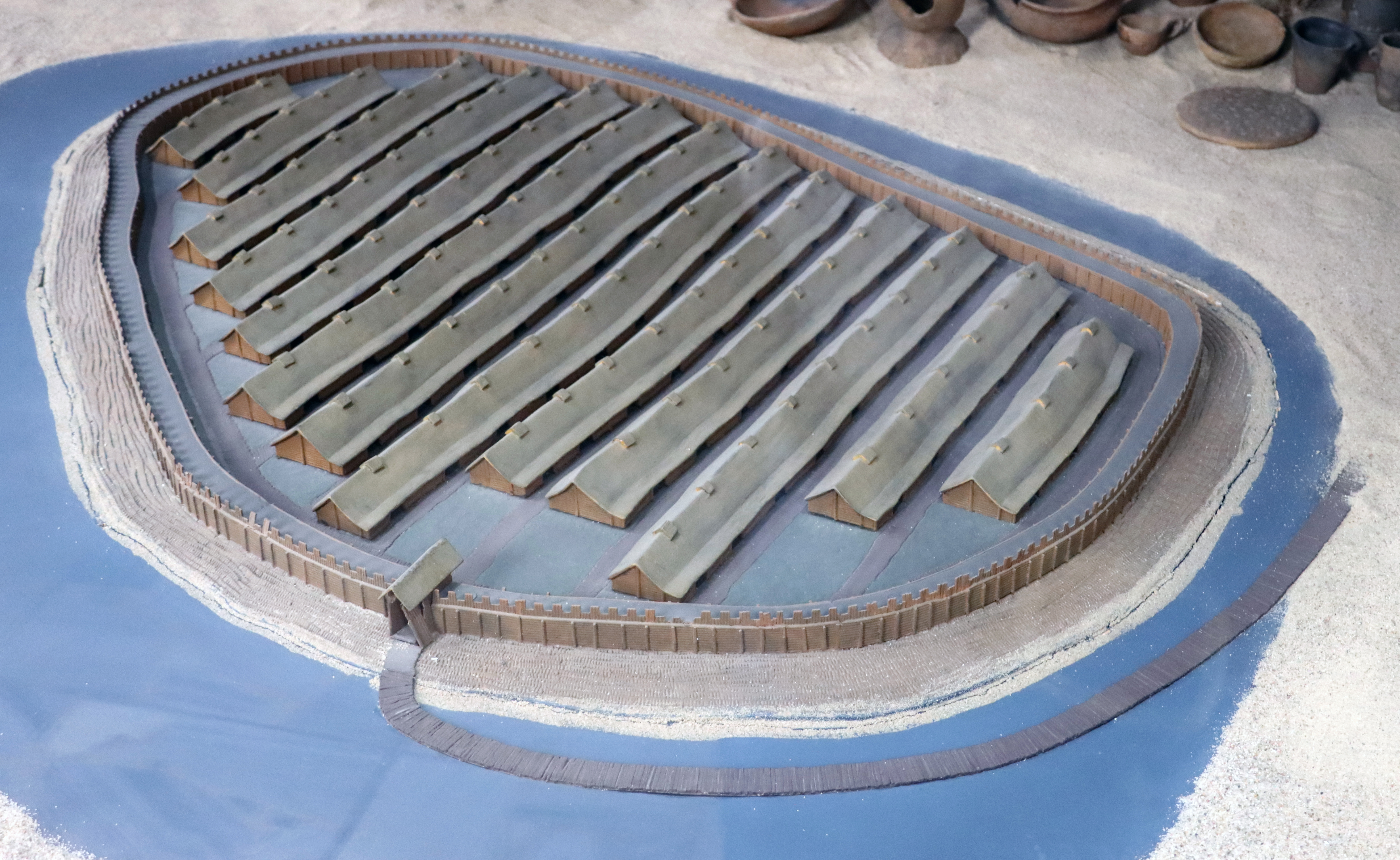 Zbudowano je wzdłuż jedenastu poprzecznych ulic, które łączyła ulica okrężna, biegnąca wzdłuż wysokiego wału. Wał ten, wraz z przylegającym doń od zewnątrz falochronem, bronił dostępu do grodu.
