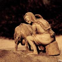 W Wielkopolsce osadnictwo ludności rolniczej nasiliło się dopiero w piątym tysiącleciu przed Chrystusem. Zaczęto wówczas zakładać osady, podobne do oglądanej na wystawie. W odróżnieniu od mezolitycznych tubylców, żyjących z dóbr dostępnych w środowisku naturalnym i stale wędrujących w poszukiwaniu żywności, rolnicy potrafili wytwarzać żywność. Podstawą ich gospodarki była uprawa zbóż oraz chów zwierząt domowych. Zajęcia rolnicze, wiedza budowlana i inne umiejętności techniczne w pewnym stopniu uniezależniły człowieka od przyrody i dzięki temu mógł on osiąść w jednym miejscu na dłużej. Przyglądając się życiu w zagrodzie z Racotu koło Kościana, spróbujmy uzmysłowić sobie, jak różne dwa światy zetknęły się ze sobą w początkach neolitu i dlaczego przez długi okres reprezentująca je ludność żyła w izolacji, prawie nie kontaktując się ze sobą. Zamiast niewielkiego szałasu mezolitycznych łowców - zbieraczy, widzimy fragmenty dwóch olbrzymich drewnianych domów wczesnych rolników o długości dochodzącej do 50 m. Wzniesiono je na wykarczowanej polanie leśnej w pobliżu rzeki. Domy zbudowano z dębowych bali, ściany uszczelniono gałęziami i gliną, a następnie pomalowano na biało. Może po to, by lepiej chronić je przed deszczem, a może i dlatego, by porażającą bielą odstraszać intruzów? Były ciepłe i solidne, o wnętrzach podzielonych na kilka pomieszczeń, w których przez długi okres mogła mieszkać liczna, wielopokoleniowa rodzina, a zimą także zwierzęta hodowlane. Teraz niewielkie ich stado bezpiecznie chroni się w przydomowej zagrodzie przed drapieżnikami. Są tam krowy, przypominające swego przodka - tura, świnie zbliżone jeszcze posturą do dzika oraz szeroko rozpowszechnione kozy i owce. We wnętrzu domu widzimy sprzęty – naczynia gliniane i warsztat tkacki, na którym z lnu lub wełny powstaje tkanina na odzież. Wokół krzątają się ludzie, wykonując nieznane wcześniej czynności. Przyjrzyjmy się im bliżej. W głębi rolnik krzemiennym sierpem ścina dojrzałe już zboże – pszenicę, jęczmień, owies lub proso. Zasiał je na wykarczowanym skrawku ziemi, spulchnionym wcześniej przy pomocy kamiennej motyki. Część ziarna zostanie starta na mąkę przy pomocy kamiennego żarna i rozcieracza, a zapasy można będzie bezpiecznie przechowywać w domu, korzystając z glinianych pojemników. Zapewnią one ludziom i zwierzętom przetrwanie zimy. W pobliżu chaty mężczyzna kończy właśnie wiercić otwory w kamiennych toporach, by osadzić je na drewnianych trzonkach. Obok możemy prześledzić kolejne fazy wykonywania naczyń z gliny; od przygotowywania surowca, poprzez ręczne lepienie z gliny formowanej w wałki, suszenie gotowych naczyń, aż do ich zdobienia i wypału w przykrytym dachem ognisku. Ryby i mięso wędzą się w zagłębionej w ziemi wędzarni; gdzieś obok znajduje się studnia. Blisko domu, zgodnie z wyznawanym kultem przodków, pochowano zmarłą kobietę. Lokowanie grobów w obrębie osady i układanie ciała na boku w pozycji skurczonej, to charakterystyczne cechy rytuału pogrzebowego najstarszej ludności rolniczej.