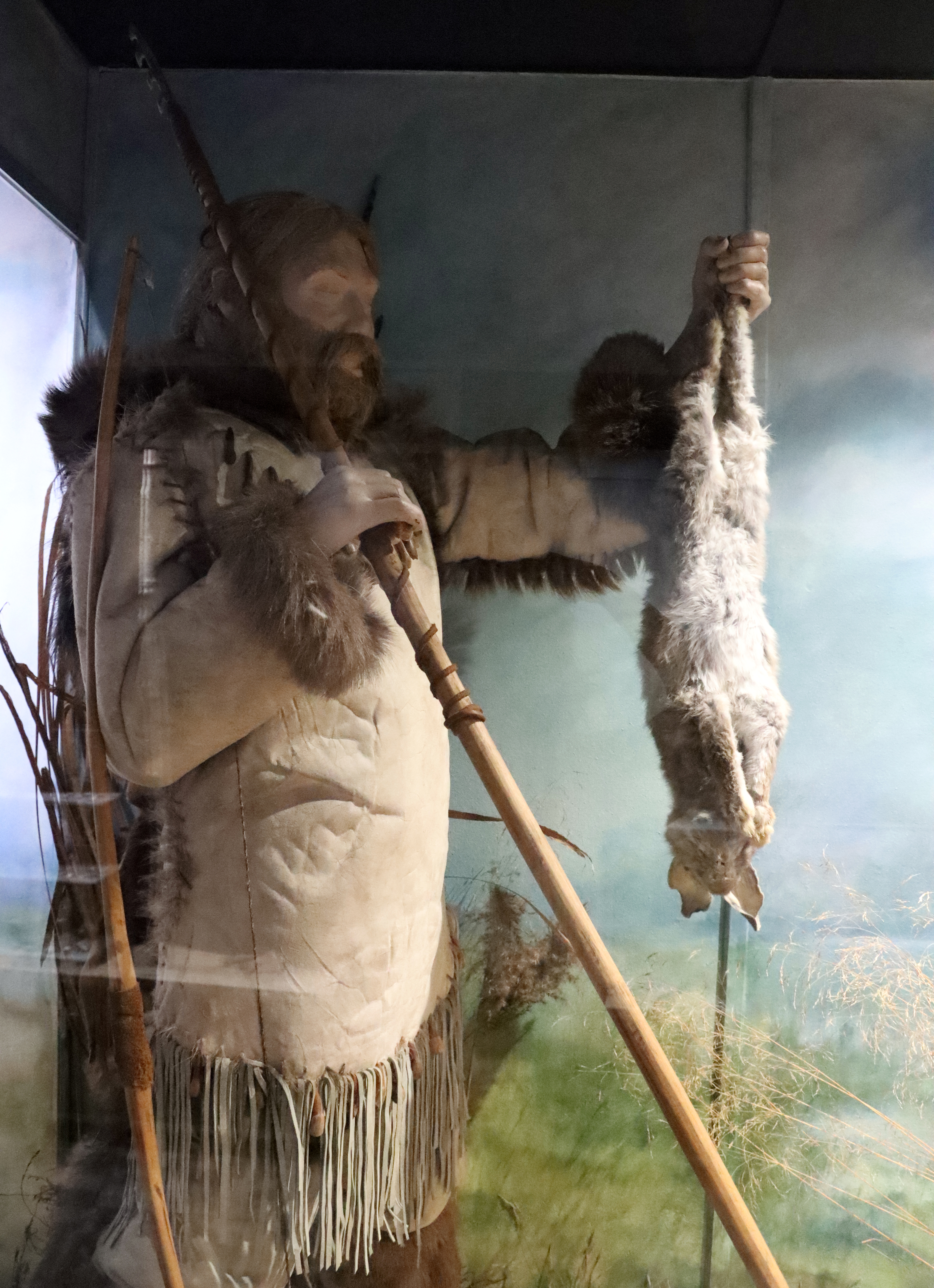 Do obozowiska powraca z polowania myśliwy. Jego uzbrojenie to łuk oraz wykonane z drewna, piór i krzemiennego ostrza strzały, noszone w kołczanie. Dodatkowa broń to oszczep zakończony harpunem z kości renifera. Jak widzimy, tym razem polowanie było udane.